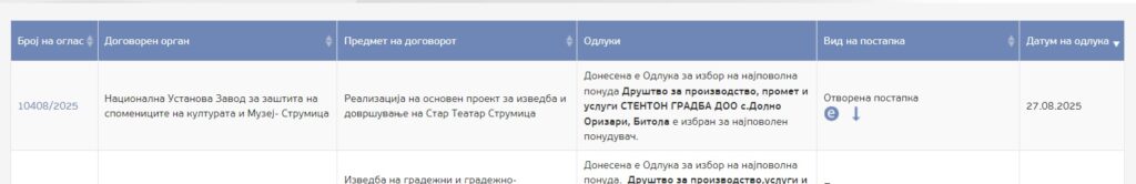 Битолската фирма „Стентон Градба“ ДОО од селото Долно Оризари, го доби тендерот за доизградба на стариот струмички театар. На распишаната јавна набавка за „Реализација на основен проект за изведба и довршување на Стар Театар Струмица“ на Национална Установа Завод за заштита на спомениците на културата и Музеј- Струмица, битолската фирма доставила најниска цена. Според информациите на Дрнка МК тие на електронската аукција доставиле понуда од 139 милиони и 104 илјади денари или околу 2,26 милиони евра. На сајтот на Бирото за јавни набавки веќе стои дека е донесена одлука, оти битолската фирма „Стентон Градба“ ДОО од с. Долно Оризари е избрана за најповолен понудувач.
