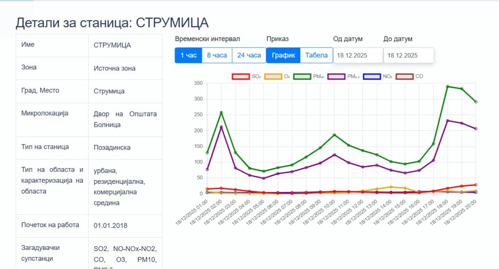Високи концентрации на штетни ПМ 10 и ПМ 2,5 покажува и државната мерна станица во кругот на ЈЗУ Здравствен дом во Струмица, односно во кругот на болничкиот комплекс вво Струмица. Станицата на Министерството за животна средина вечерва околу 20 часот и 30 минути покажа околу 300 микрграми ПМ 10 честички на метар кубен. Таа два дена покажа дека просечните дневни вредности на ПМ 10 честичките се над 150 микрограми на метар кубен.