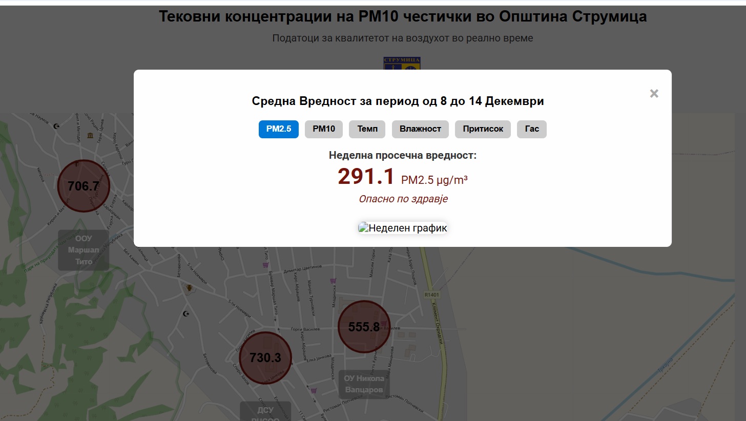 Екстремно лош, опасен по здравје. Вака алармираат мерните станици на Министерството за животна среднина но и на Општина Струмица, вечерва околу 20 часот и 30 минути. Пиковите на штетните ПМ 10 честички на сите мерни станици што ги постави општината се во црвена алармантна боја. На мерната станица кај ДСУ „Никола Карев“ во Струмица кај 20 часот и 30 минути, станицата покажа и над 700 микрограми штетни ПМ 10 честички на метар кубен. Околу 550 поокажуваше станицата кај ООУ „Никола Вапцаров“ а помалку станицата кај ООУ „Маршал Тито“. Високи концентрации на ПМ 10 честички односно над дозволеното имаше и кај градинката Виножито, влезот на Струмица од кај Радовиш и кај Мало стопанство на излезот од Струмица кон Дабиље но не како кај средното училиште Никола Карев.