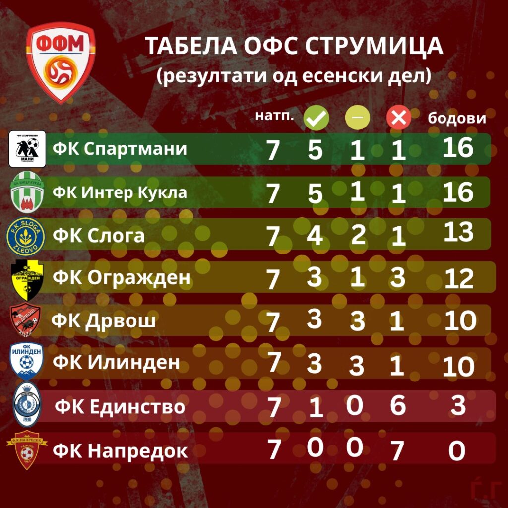 Инаку Спратмани и Интер Кукла се на првите две позиции со по 16 бода. Слога Злеово е трета со 12 а Огражден од Ново село со 12 поени. Дрвош и Илинден од Добрејци имаат по 10 а Единство од Пиперево со една победа е претпоследна а Напредок од Радово последен на табелата.