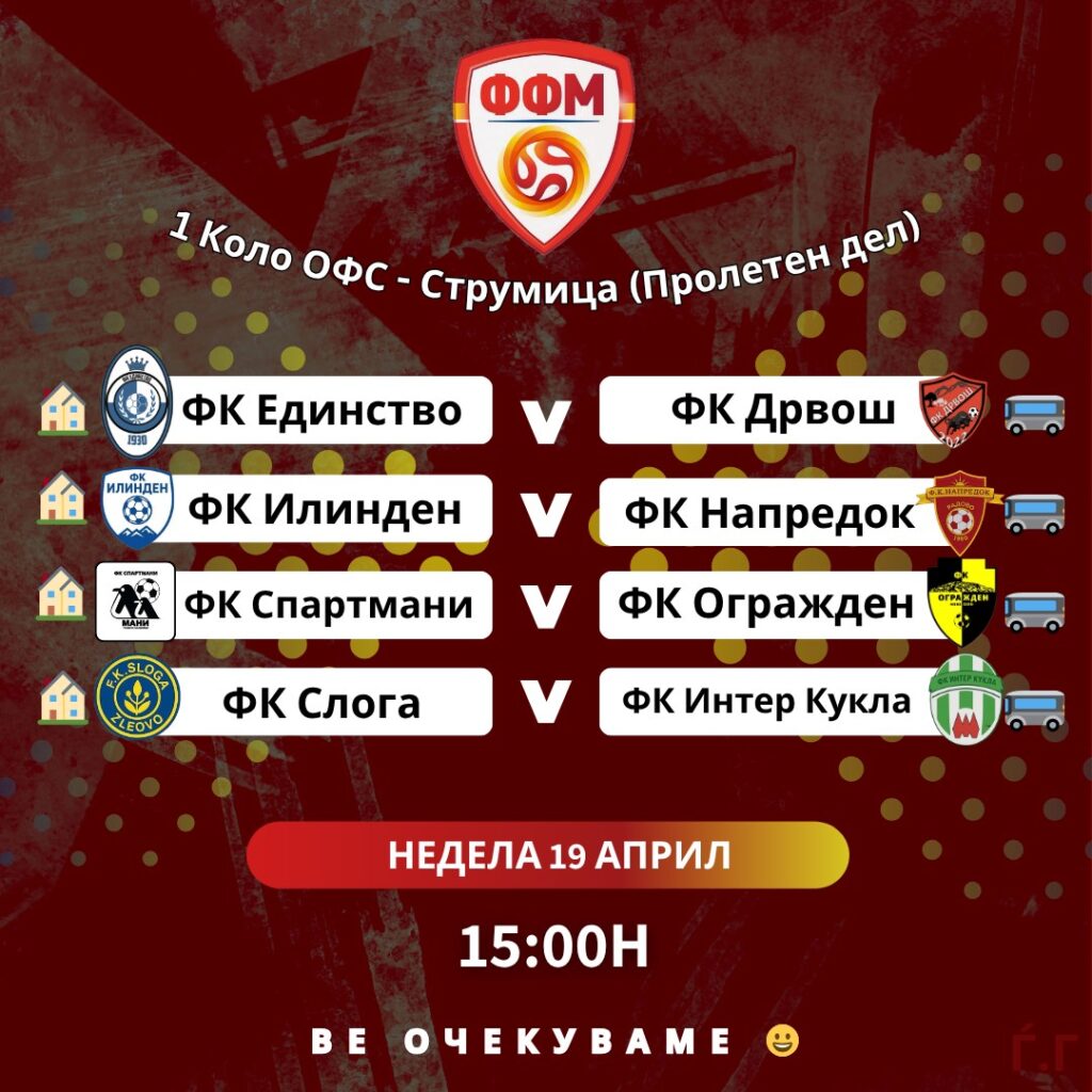 Утре се крева завесата на пролетниот дел од фудбалското првенство или општинската лига на ОФС Струмица каде партиципираат осум екипи. Во рамките на првото коло од пролениот дел има два натпревари кои го привлекуваат вниманието пред се поради исходот од есенскиот дел на првенството. Водечките четири екипи кои атакуваат за тронот играат меѓу себе.