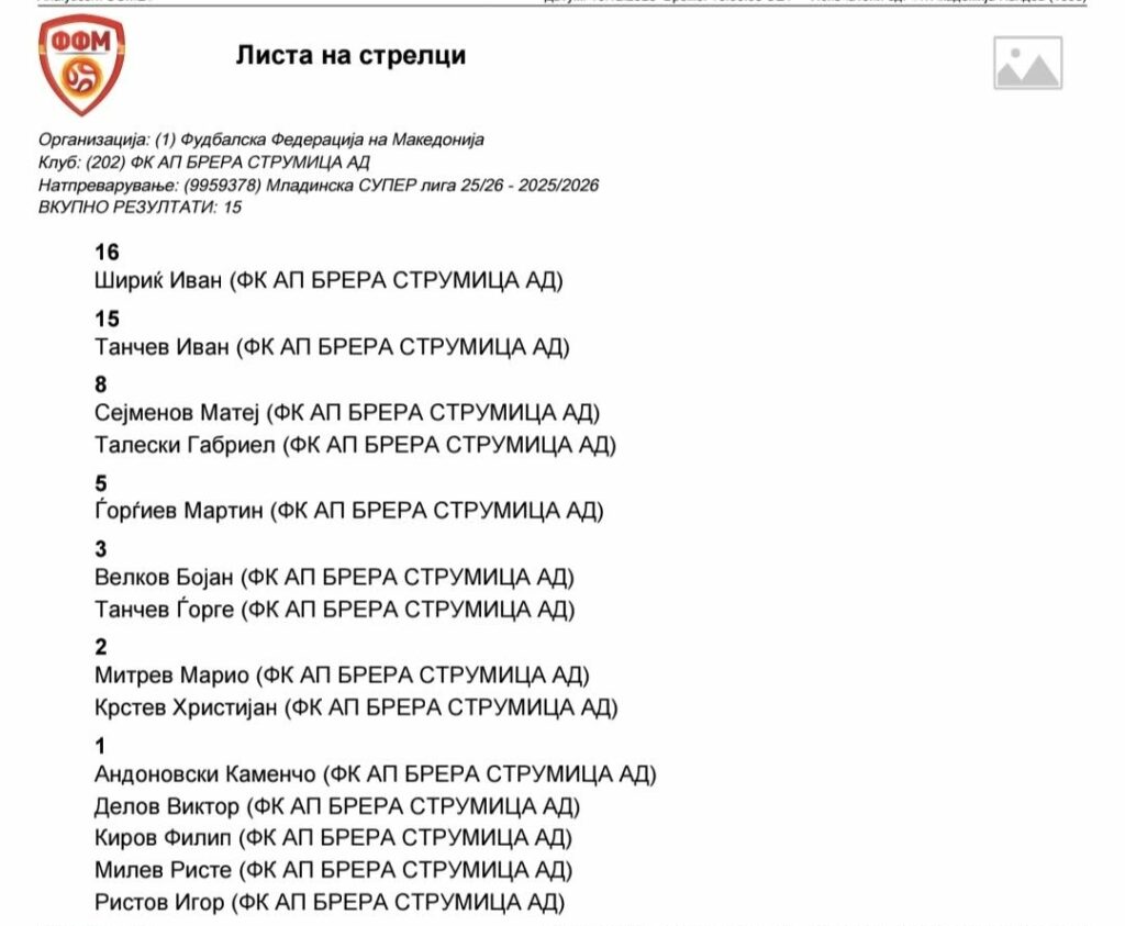 Иван Шириќ и Иван Танчев се најефикасните кај младите на Брера. Шириќ 16 пати ја затресе мрежата на противниците додека Танчев има 15 погодоци. Матеј Сејменов и Габриел Талески запишаа по 8 гола. Голови постигнаа и останатите фудбалери. На голот пак кај струмичани одлични голманите Александар Трајков и Методи Давчев кои се енигма за противниците.