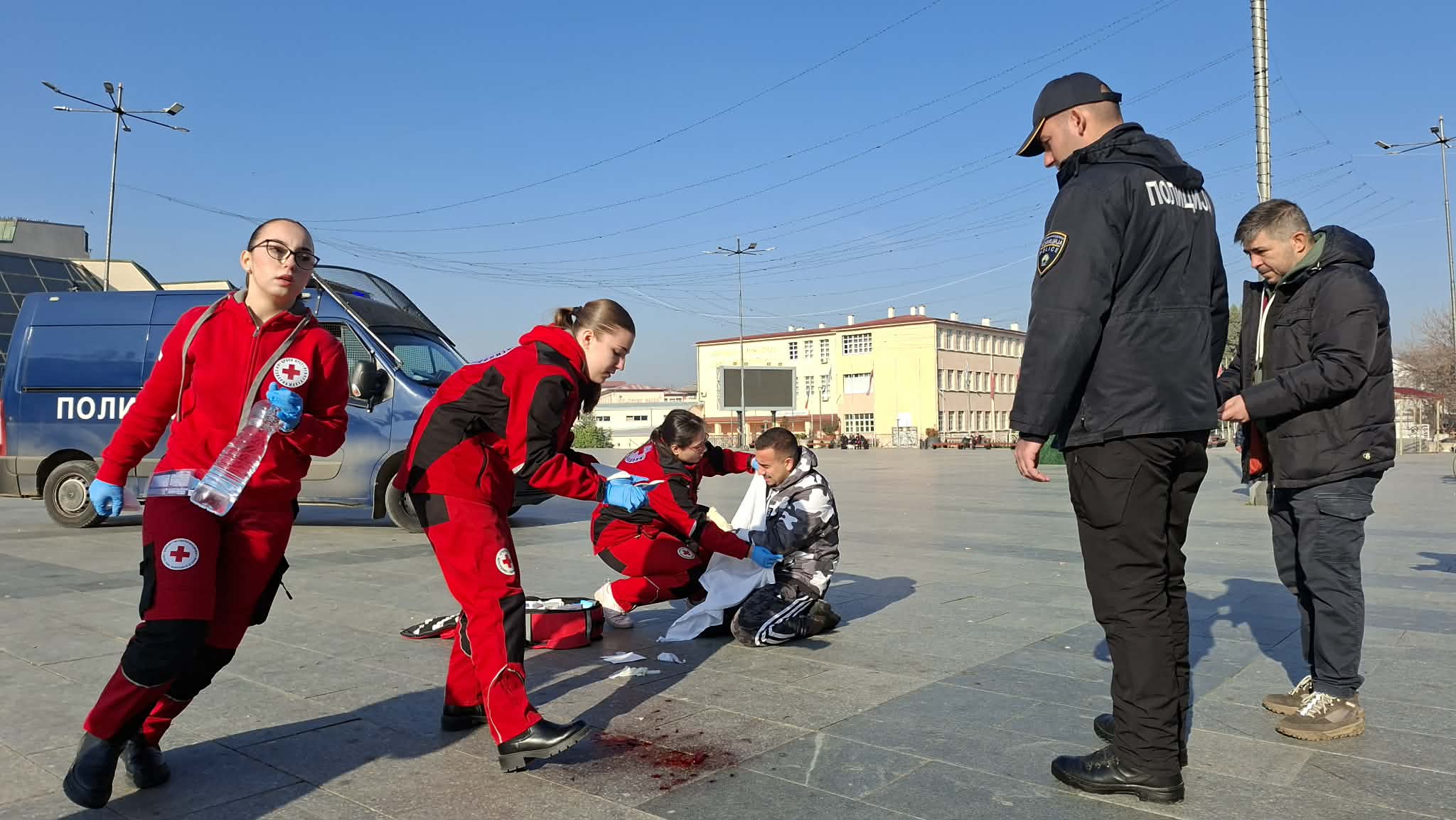 Во вежбата, младо лице со пукање петарда губи два прста. Врисоци од болка. Другарите беспомошни. Доаѓа полиција пота и Црвен крст чии волонтери даваат прва помош. Сето тоа со една јасна порака – за време на празниците да не се користат петарди