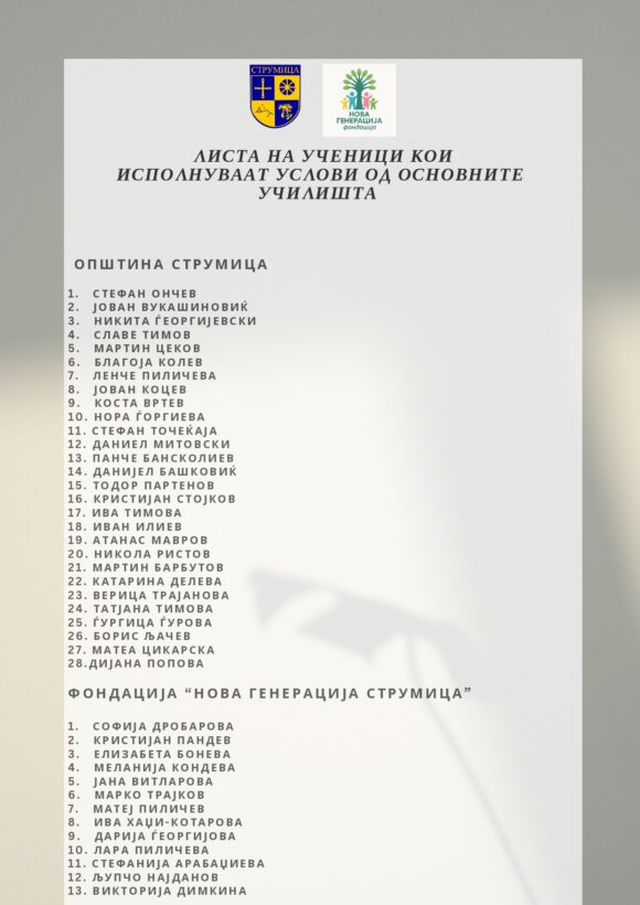 Општина Струмица ја објави листата на основци и средношколци кои ќе добиваат стипендии во времетраење од 9 месеци во висина од 2000 и 2500 денари. Станува збор за стипеднии од Општина Струмица и Фондацијата ,,Нова Генерација“ за кои имаше објавено Јавен повик а наменети за сите ученици кои во текот на претходната учебна година имаат освоена прва, втора или трета награда на меѓународен, државен, регионален или општински натпревар.