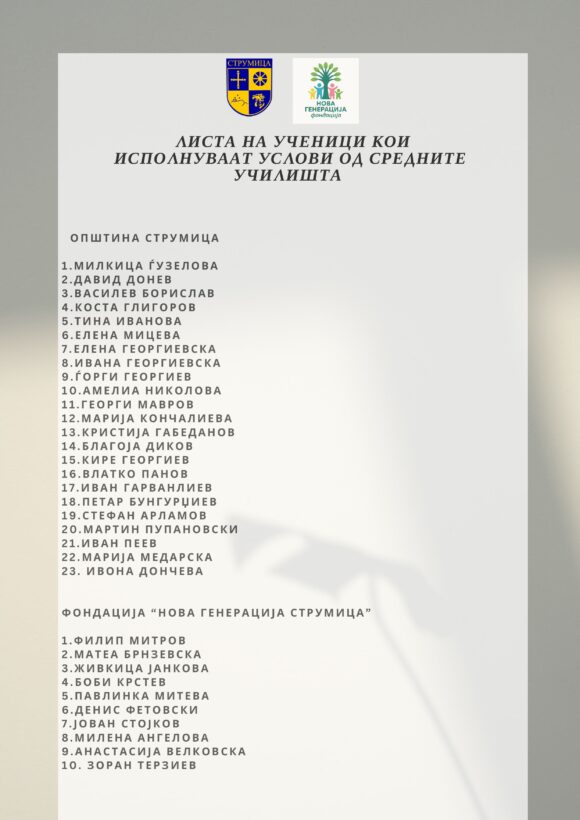 Општина Струмица ја објави листата на основци и средношколци кои ќе добиваат стипендии во времетраење од 9 месеци во висина од 2000 и 2500 денари. Станува збор за стипеднии од Општина Струмица и Фондацијата ,,Нова Генерација“ за кои имаше објавено Јавен повик а наменети за сите ученици кои во текот на претходната учебна година имаат освоена прва, втора или трета награда на меѓународен, државен, регионален или општински натпревар.