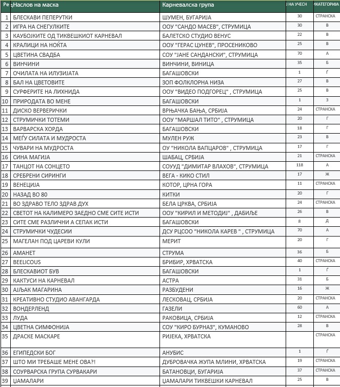 Според доставената табела на големото интернационално карневалско дефиле во Струмица ќе има 28 маски од земјава и 11 од странство. Од Македонија пријавени се 24 групни и 4 поединечни маски додека од странство доаѓаат групи од Бугарија, Србија, Хрватска и Црна Гора