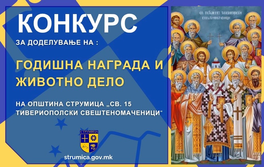 Општина Струмица го распиша Конкурсот за доделување на Годишна награда и животно дело „Св. Петнаесет Тивериополски Свештеномаченици”, а по повод 11 Декември – Денот на заштитниците на градот.