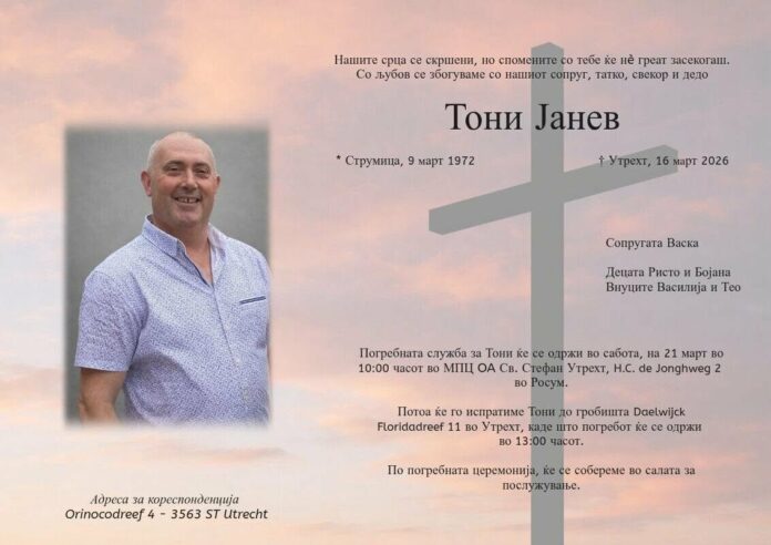 По кратко боледување почина 54 годишниот Тони Јанев од Струмица кој беше еден од основачите и двигателите за изградба на Македонска православна црква во Холандија. Јанев кој со семејството повеќе од две децении живееше во Утрехт Холандија , контуинирано се залагаше за меѓусебно почитување и негување на семејни вредности низ призмата на нашата Православна вера, надвор од својата татковина. Црквата ,,Свети Стефан“ во Холандија го посочи Јанев како пример за сите кои се надвор од Македонија како со љубов и посветеност се постигнува тоа што се сака во интерес на својот народ.