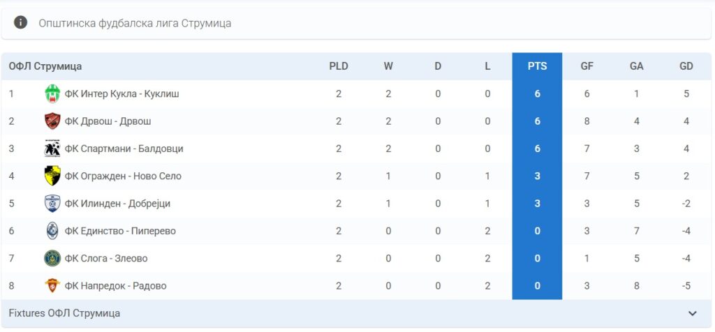 Интер Кукла, Спартамни и Дрвош се трите водечки позици со по 6 бода. Огражден од Ново Село и Илинден од Добрејци се на 4 и 5 позиција а без бодови се екипите на Напредок од Радово, Единство од Пиперево и Слога од Злеово. (В.Трајков)