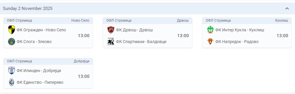 Екипата на Интер Кукла во Куклиш која е лидер на табелата го пречекува младиот состав на Напредок од Радово. Фудбалерите на Напредок ќеа се обидат да ги изненадат куклишани на домашен терен а Огражден од Ново Село е фаворит во дуелот со Слога од Злеово.